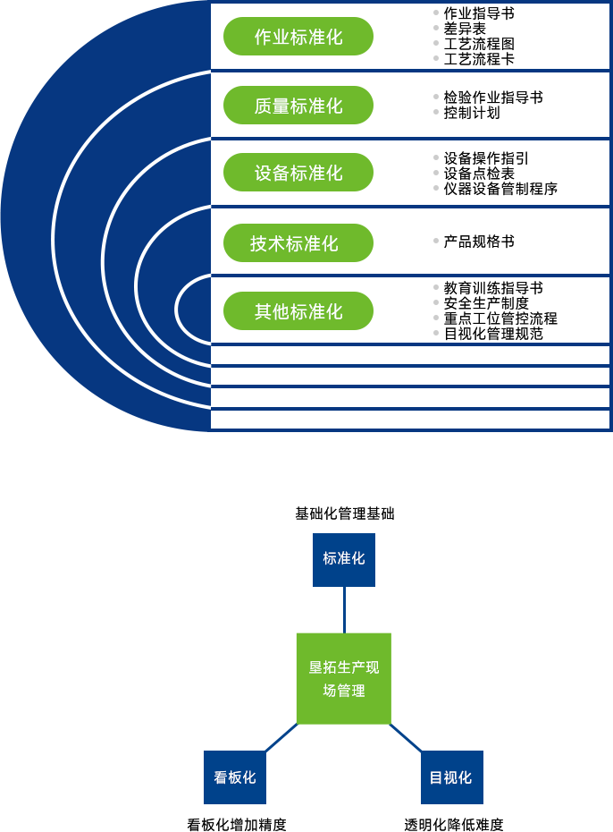主要由標準化/目視化/看板化三個支柱支撐;標準化是基準化的管理基礎(chǔ),看板化增加精度,目視化降低難度。